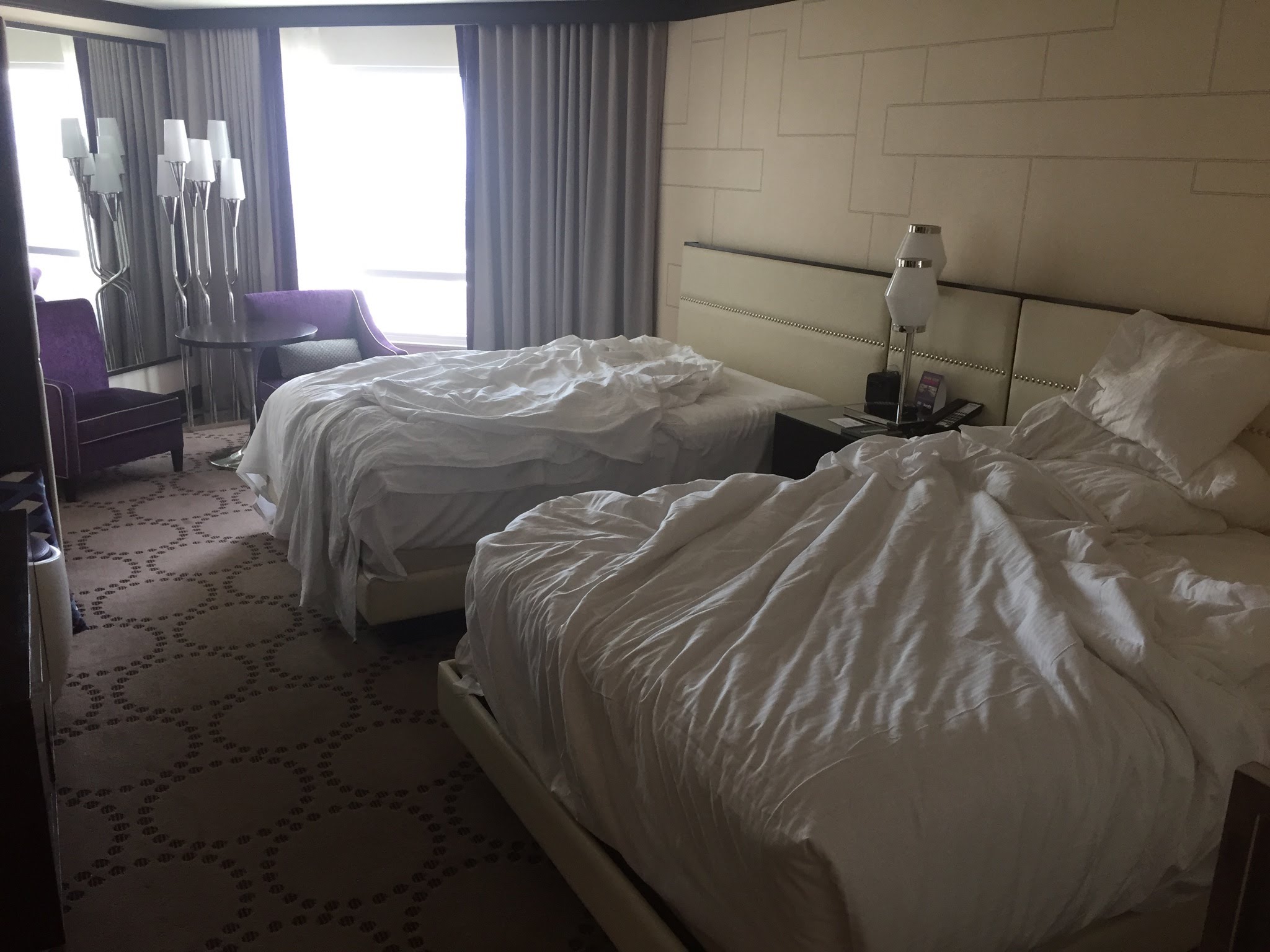 Look at a room with 2 beds and a pull out couch. Las vegas nv. Beds feature premium bedding.